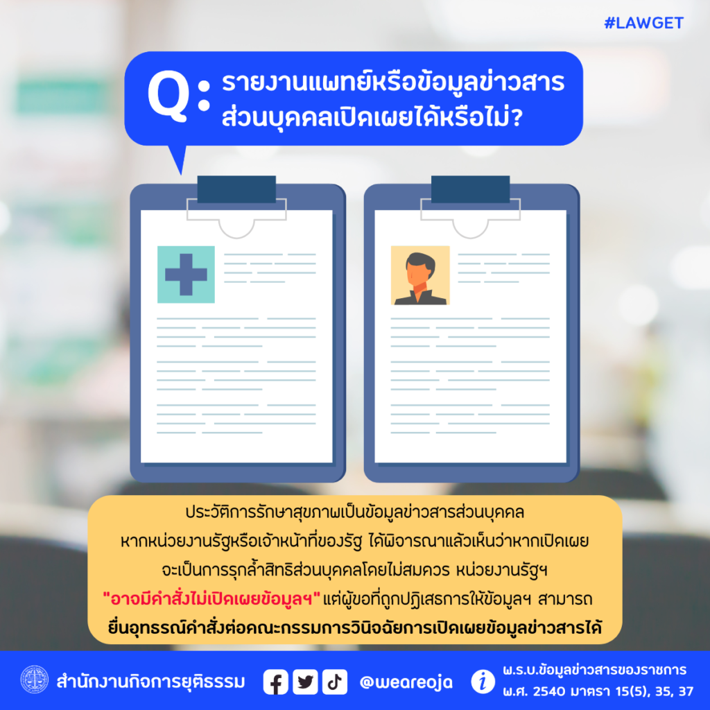 ประวัติการรักษาสุขภาพเป็นข้อมูลข่าวสารส่วนบุคคล หากหน่วยงานรัฐหรือเจ้าหน้าที่ของรัฐ ได้พิจารณาแล้วเห็นว่า หากเปิดเผยจะเป็นการรุกล้ำสิทธิส่วนบุคคลโดยไม่สมควร หน่วยงานรัฐฯ “อาจมีคำสั่งไม่เปิดเผยข้อมูลฯ” แต่่ผู้ขอที่ถูกปฏิเสธให้ข้อมูลฯ สามารถยื่นอุทธรณ์คำสั่งต่อคณะกรรมการวินิจฉัยการเปิดเผยข้อมูลข่าวสารได้…