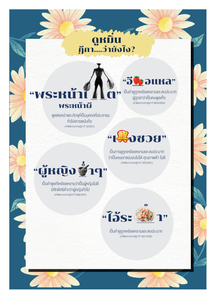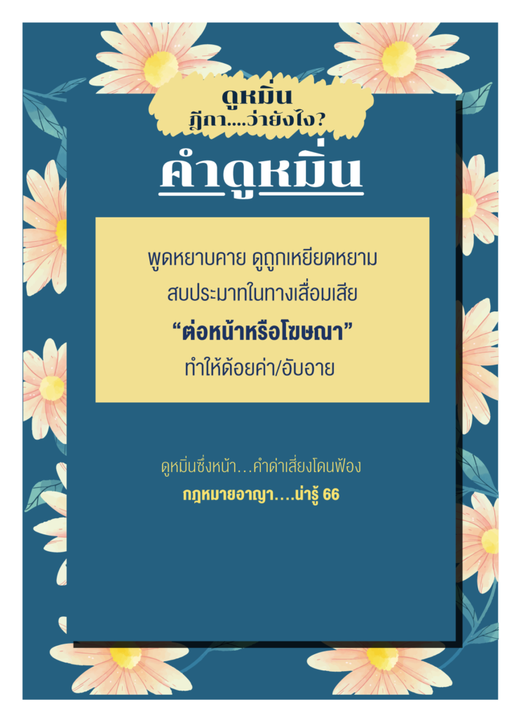 - ดูหมิ่นผู้อื่น “ต่อหน้า” หรือ “ด้วยการโฆษณา” (ม.393) : จำคุกไม่เกิน 1 เดือน หรือปรับไม่เกินหนึ่ง 10,000 บาท หรือทั้งจำทั้งปรับ