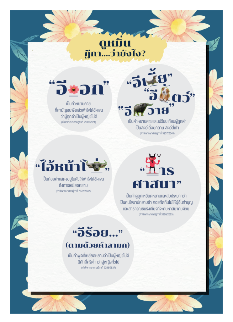 - คำด่าหยาบคาย เพื่อให้สะใจคนด่าเจ็บใจคนฟัง เป็นการทำร้ายกันด้วยคำพูด แบบนี้เขาเรียกว่า “ดูหมิ่นซึ่งหน้า” ด่าคนอื่นข้างเดียว คนด่าก็ผิดคนเดียวถ้าต่างฝ่ายต่างด่ากัน ก็มีความผิดกันทั้งคู่