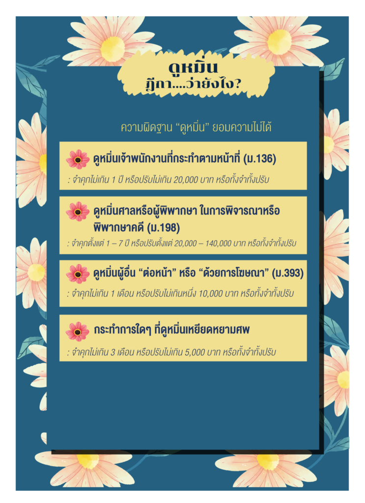 - กระทำการใดๆ ที่ดูหมิ่นเหยียดหยามศพ : จำคุกไม่เกิน 3 เดือน หรือปรับไม่เกิน 5,000 บาท หรือทั้งจำทั้งปรับ