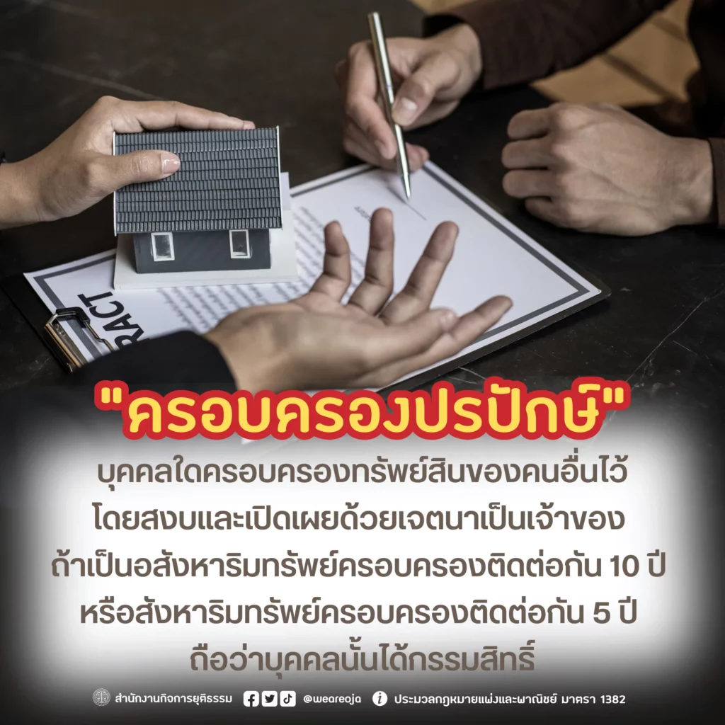 “บุคคลใดครอบครองทรัพย์สินของคนอื่นไว้โดยสงบและเปิดเผยด้วยเจตนาเป็นเจ้าของ ถ้าเป็นอสังหาริมทรัพย์ครอบครองติดต่อกัน 10 ปี หรือสังหาริมทรัพย์ครอบครองติดต่อกัน 5 ปี ถือว่าบุคคลนั้นได้กรรมสิทธิ์โดยการครอบครองปรปักษ์” (ป.พ.พ.มาตรา 1382)