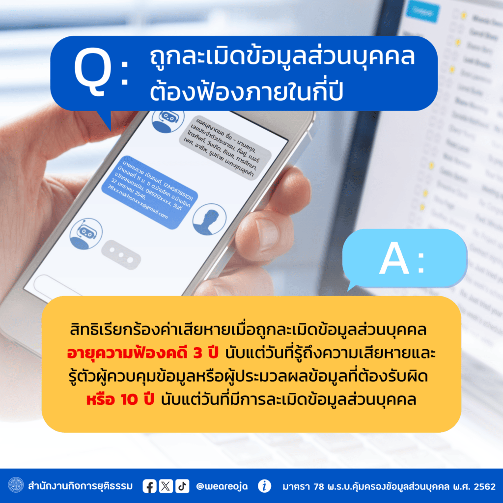 อายุความฟ้องคดี 3 ปี นับแต่วันที่ผู้เสียหายรู้ถึงความเสียหายและรู้ตัวผู้ควบคุมข้อมูลส่วนบุคคลหรือผู้ประมวลผลข้อมูลส่วนบุคคลที่ต้องรับผิด หรือ 10 ปี นับแต่วันที่มีการละเมิดข้อมูลส่วนบุคคล