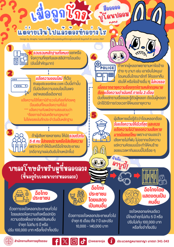 5. ผู้เสียหายเมื่อรู้ตัวว่าโดนหลอกต้องรีบแจ้งความให้เร็วที่สุด และควรแจ้งความไม่ว่ายอดความเสียหายมากน้อยแค่ไหน เพราะบางคนอาจมองว่าเสียหายไม่กี่พัน ไม่อยากแจ้งความ แต่ความคิดแบบนี้ทำให้คนร้ายลอยนวลหากินแบบนี้ไปเรื่อยๆ